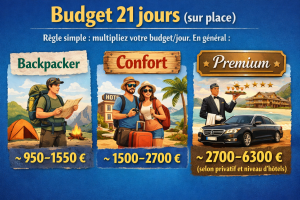 | Durée | Budget local / pers. (hors vols) | Budget total indicatif avec vols | Profil de circuit |